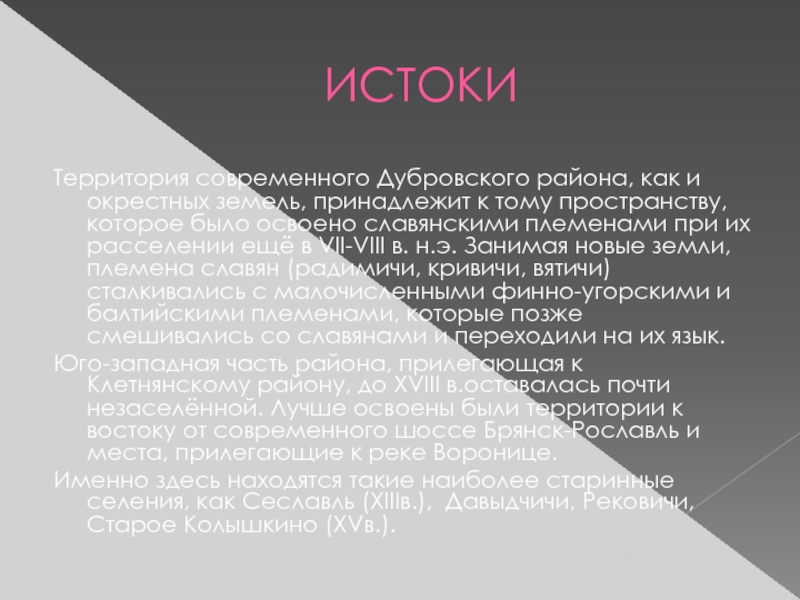 пространству, которое было освоено славянскими племенами при их расселении ещё в VII-VIII в. н.э. Занимая новые земли, племена славян (радимичи, кривичи, вятичи) сталкивались с малочисленными финно-угорскими и балтийскими племенами, которые позже смешивались со славянами и переходили на их язык.