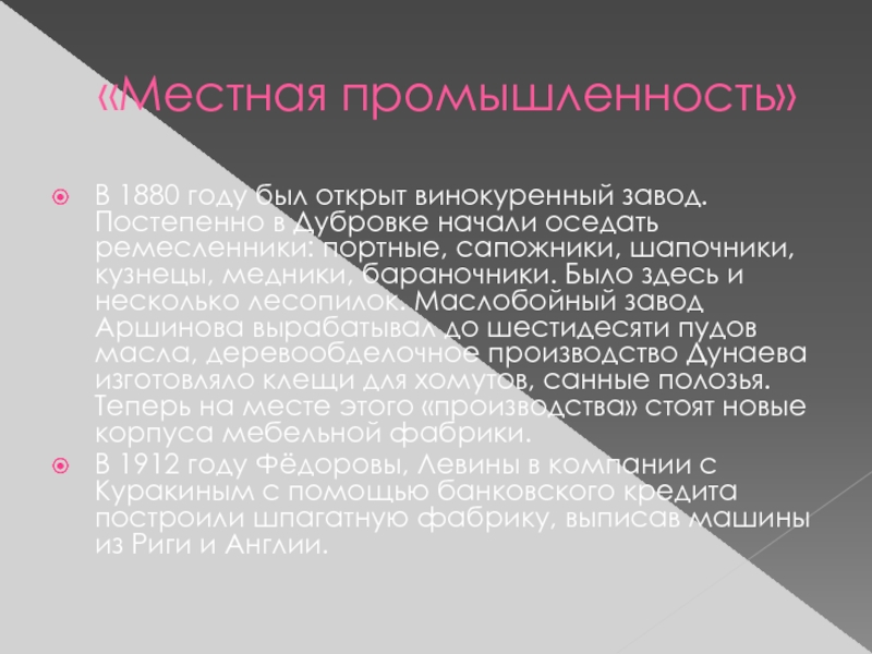 В 1880 году был открыт винокуренный завод. Постепенно в Дубровке