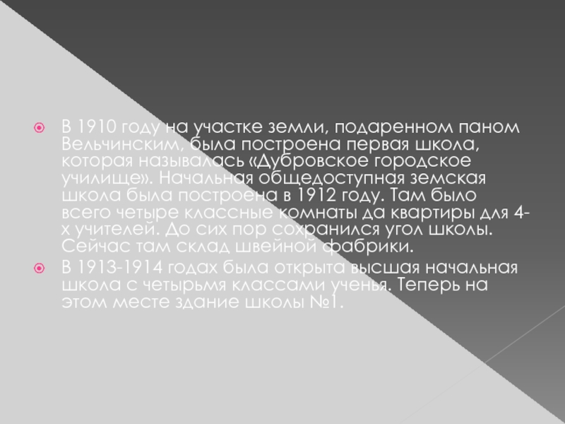 первая школа, которая называлась «Дубровское городское училище». Начальная общедоступная земская школа была построена в 1912 году. Там было всего четыре классные комнаты да квартиры для 4-х учителей. До сих пор сохранился угол школы. Сейчас там склад швейной фабрики.