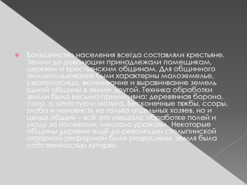и крестьянским общинам. Для общинного землепользования были характерны малоземелье, узкополосица, вклинивание и выравнивание земель одной общины в земли другой. Техника обработки земли была весьма примитивна: деревянная борона, соха, а зачастую и мотыга. Бесконечные тяжбы, ссоры, злоба и ненависть не только отдельных хозяев, но и целых общин – всё это мешало обработке полей и уходу за посевами, мешало урожаям. Некоторые общины-деревни ещё до революции столыпинской аграрной реформой были разрушены, земля была собственностью хуторян.