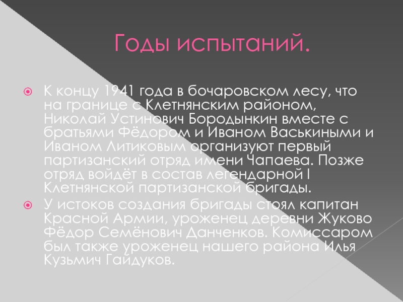с Клетнянским районом, Николай Устинович Бородынкин вместе с братьями Фёдором и Иваном Васькиными и Иваном Литиковым организуют первый партизанский отряд имени Чапаева. Позже отряд войдёт в состав легендарной I Клетнянской партизанской бригады.