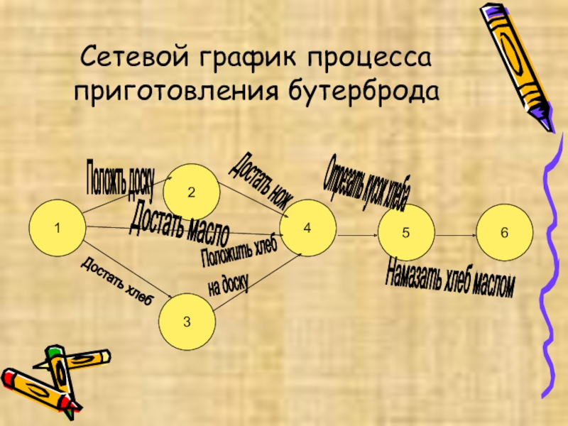 Слайд 14Сетевой график процесса приготовления бутерброда