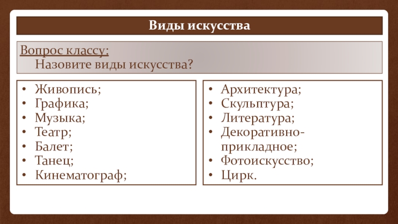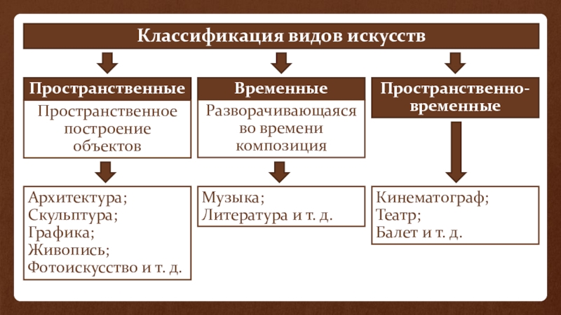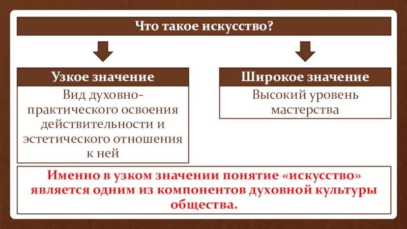 Именно в узком значении понятие «искусство» является одним из компонентов духовной культуры общества.