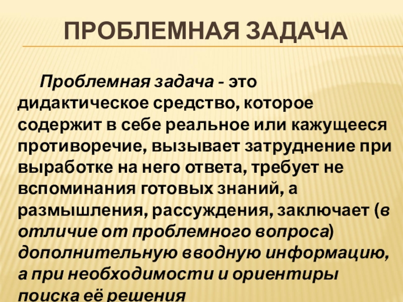 содержит в себе реальное или кажущееся противоречие, вызывает затруднение при выработке на него ответа, требует не вспоминания готовых знаний, а размышления, рассуждения, заключает (в отличие от проблемного вопроса) дополнительную вводную информацию, а при необходимости и ориентиры поиска её решения