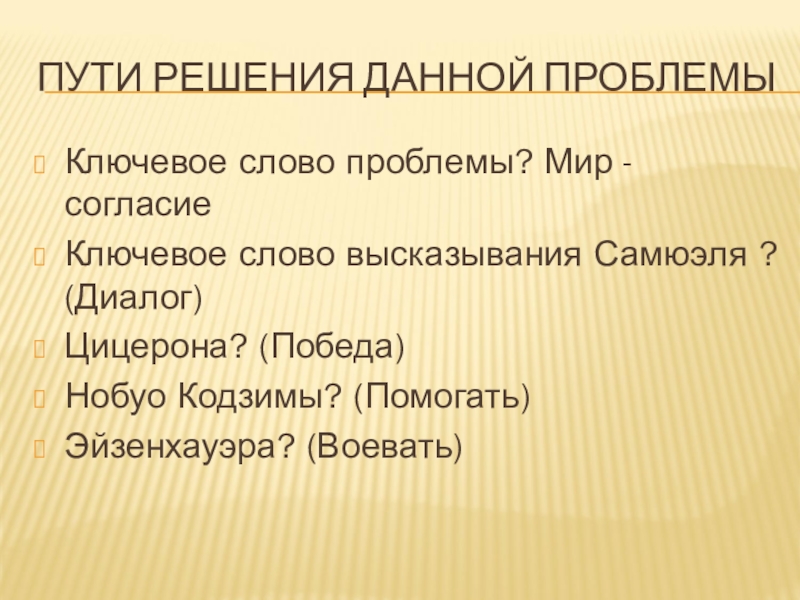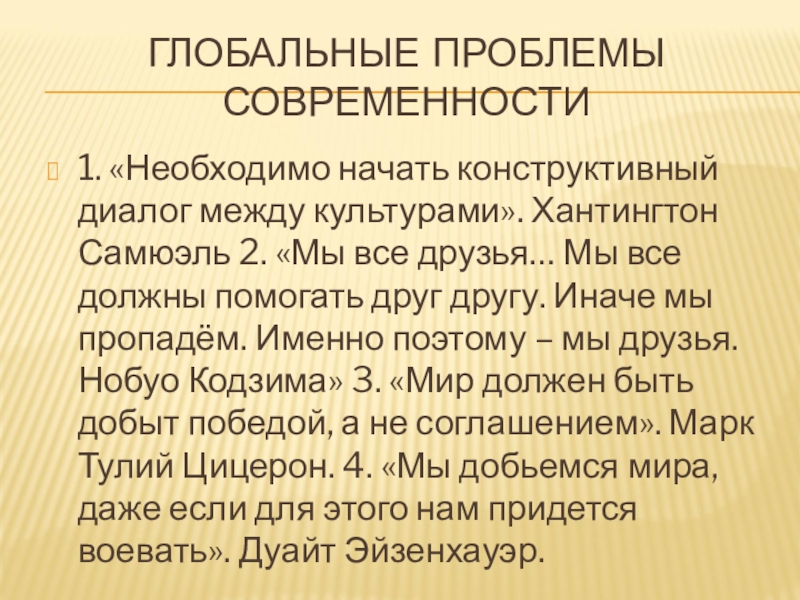 2. «Мы все друзья… Мы все должны помогать друг другу. Иначе мы пропадём. Именно поэтому – мы друзья. Нобуо Кодзима» 3. «Мир должен быть добыт победой, а не соглашением». Марк Тулий Цицерон. 4. «Мы добьемся мира, даже если для этого нам придется воевать». Дуайт Эйзенхауэр.