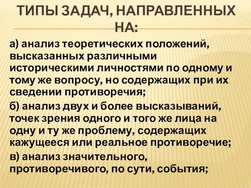 б) анализ двух и более высказываний, точек зрения одного и того же лица на одну и ту же проблему, содержащих кажущееся или реальное противоречие;