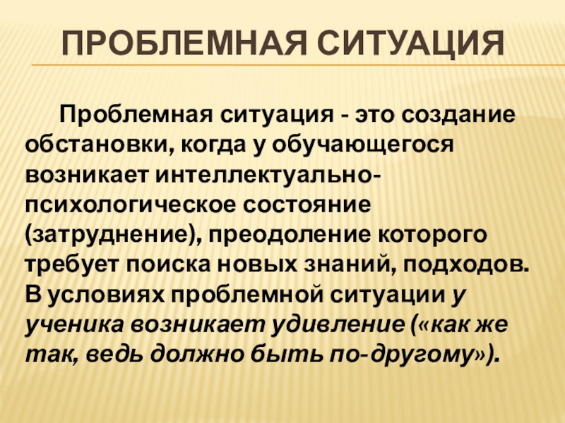 у обучающегося возникает интеллектуально-психологическое состояние (затруднение), преодоление которого требует поиска новых знаний, подходов. В условиях проблемной ситуации у ученика возникает удивление («как же так, ведь должно быть по-другому»).