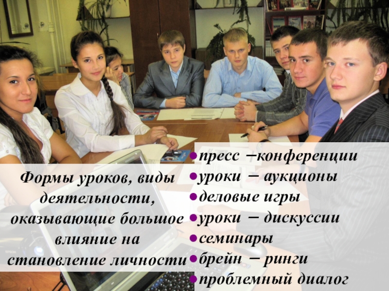 Слайд 4Формы уроков, виды деятельности, оказывающие большое влияние на становление личности