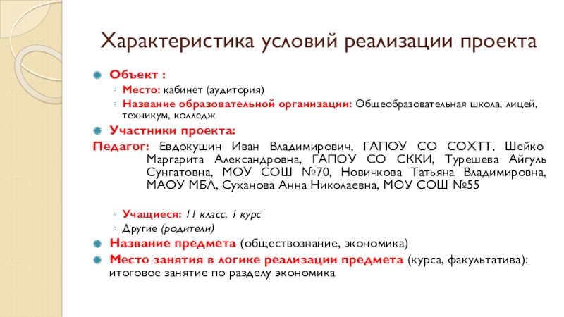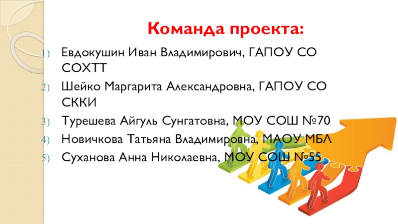 Педагог: Евдокушин Иван Владимирович, ГАПОУ СО СОХТТ, Шейко Маргарита Александровна, ГАПОУ СО СККИ, Турешева Айгуль Сунгатовна, МОУ СОШ №70, Новичкова Татьяна Владимировна, МАОУ МБЛ, Суханова Анна Николаевна, МОУ СОШ №55