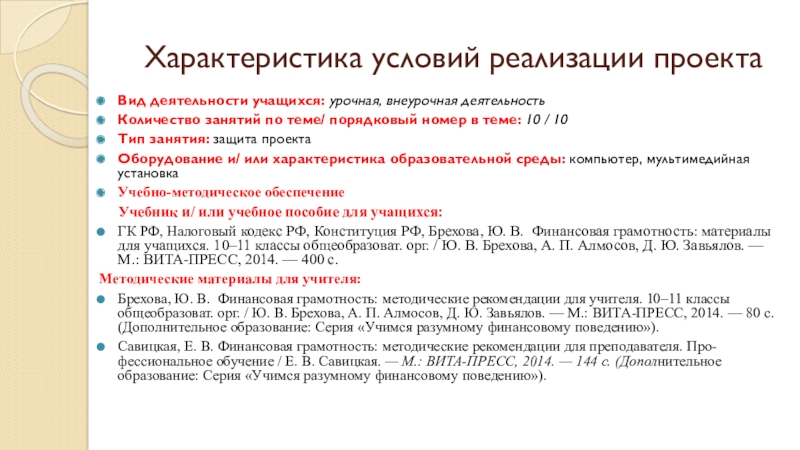 Брехова, Ю. В. Финансовая грамотность: методические рекомендации для учителя. 10–11 классы общеобразоват. орг. / Ю. В. Брехова, А. П. Алмосов, Д. Ю. Завьялов. — М.: ВИТА-ПРЕСС, 2014. — 80 с. (Дополнительное образование: Серия «Учимся разумному финансовому поведению»).