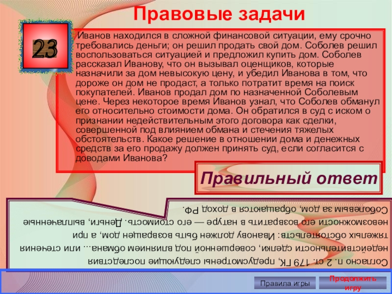 Согласно п. 2 ст. 179 ГК, предусмотрены следующие последствия недействительности сделки, совершенной под влиянием обмана... или стечения тяжелых обстоятельств: Иванову должен быть возвращен дом, а при невозможности его возвратить в натуре — его стоимость. Деньги, выплаченные Соболевым за дом, обращаются в доход РФ.