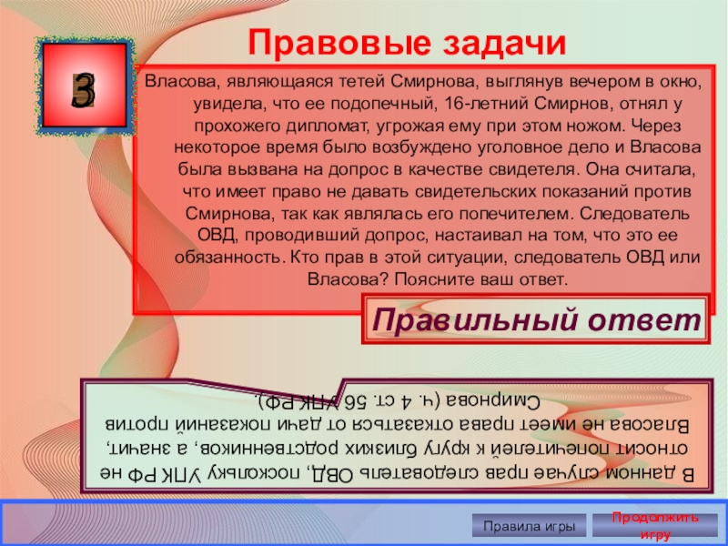 В данном случае прав следователь ОВД, поскольку УПК РФ не относит попечителей к кругу близких родственников, а значит, Власова не имеет права отказаться от дачи показаний против Смирнова (ч. 4 ст. 56 УПК РФ).
