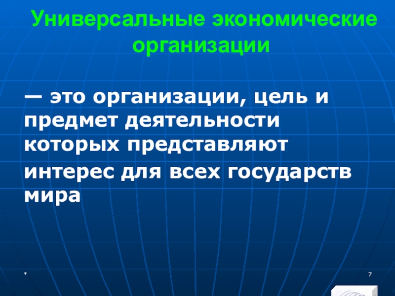 Универсальные экономические организации— это организации, цель и предмет деятельности которых представляютинтерес для всех государств мира*