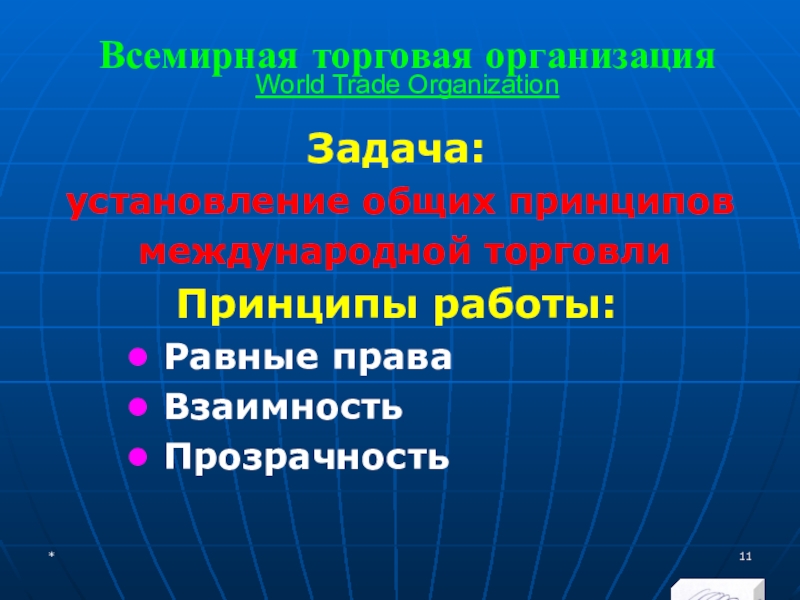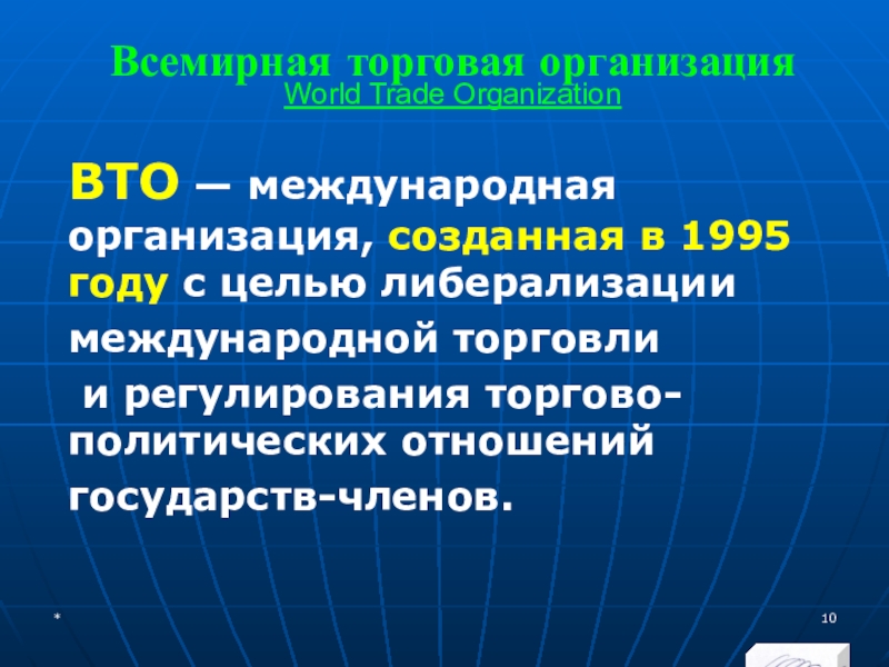 Всемирная торговая организация World Trade OrganizationВТО — международная организация, созданная в 1995 году с целью либерализации международной