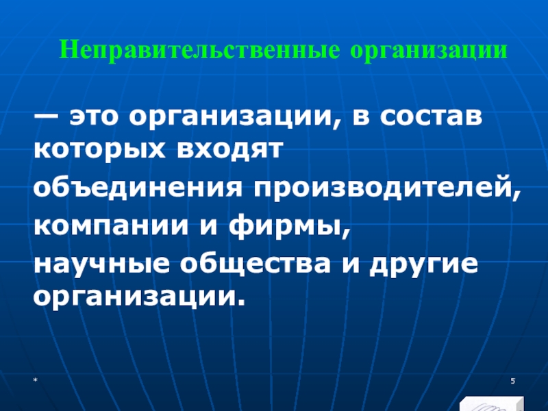 Неправительственные организации — это организации, в состав которых входят объединения производителей, компании и фирмы, научные общества и