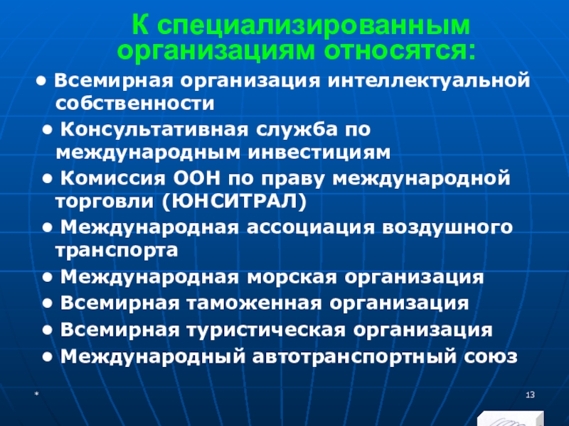 К специализированным организациям относятся:• Всемирная организация интеллектуальной собственности • Консультативная служба по международным инвестициям • Комиссия
