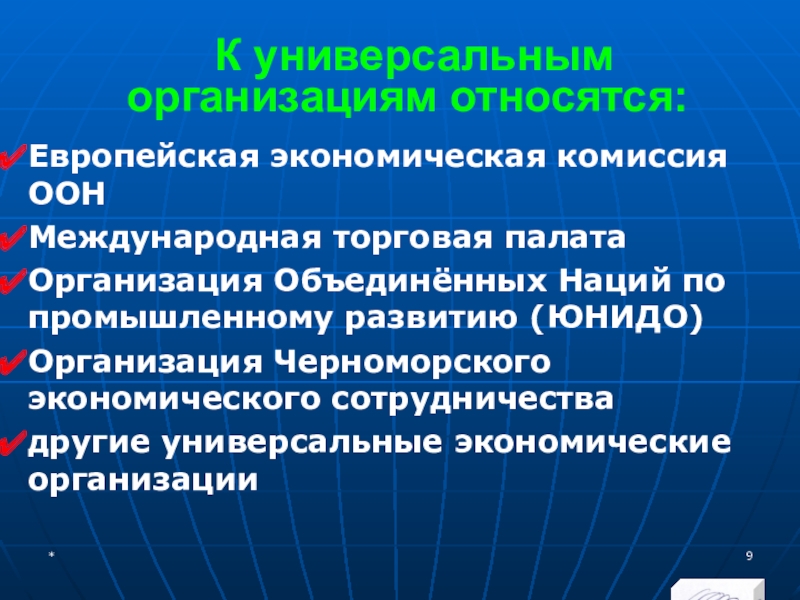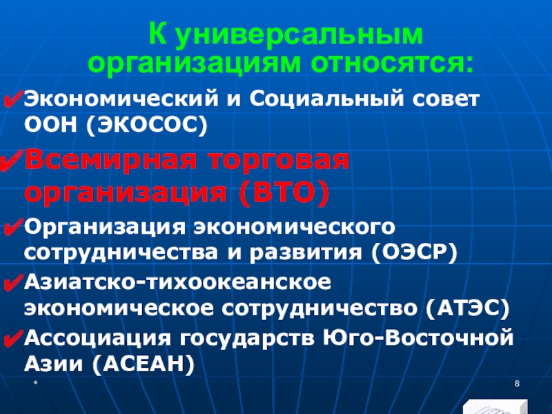 К универсальным организациям относятся:Экономический и Социальный совет ООН (ЭКОСОС) Всемирная торговая организация (ВТО) Организация экономического сотрудничества