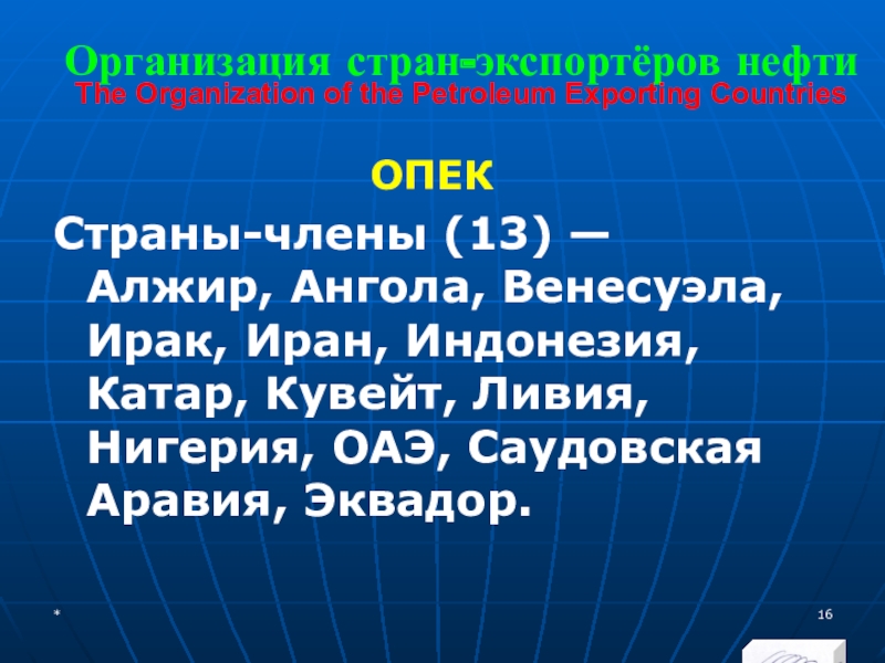 Слайд 16Организация стран-экспортёров нефти The Organization of the Petroleum Exporting Countries