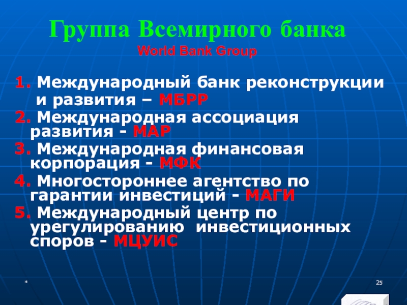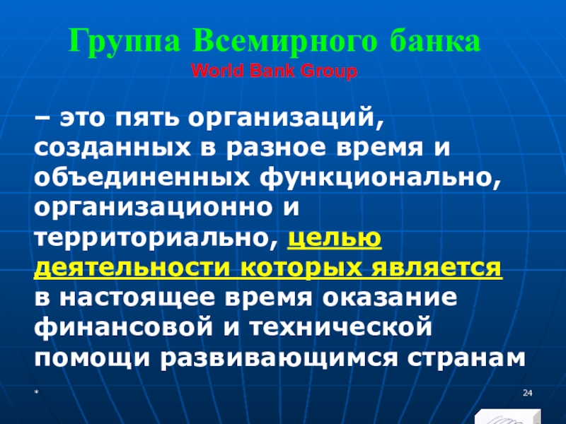 Группа Всемирного банка World Bank Group – это пять организаций, созданных в разное время и объединенных функционально,