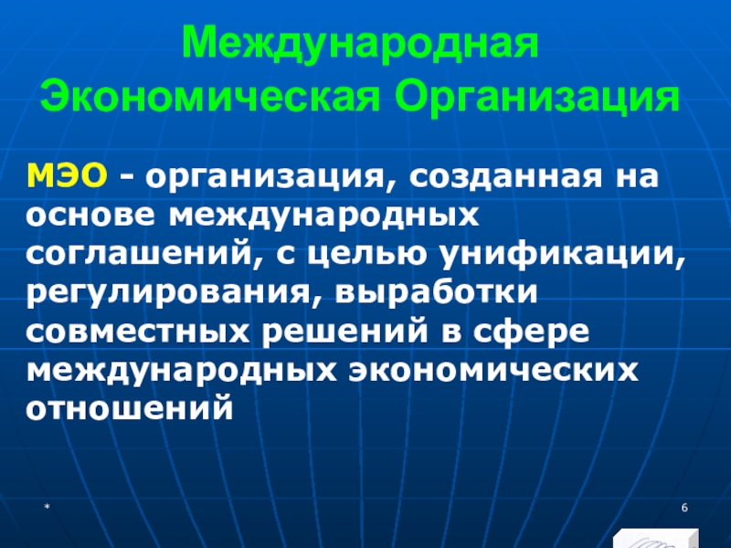 Международная Экономическая Организация МЭО - организация, созданная на основе международных соглашений, с целью унификации, регулирования, выработки совместных