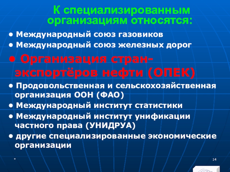 К специализированным организациям относятся:• Международный союз газовиков • Международный союз железных дорог • Организация стран-экспортёров нефти