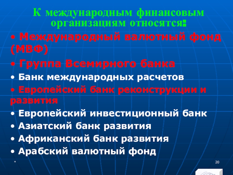 К международным финансовым  организациям относятся:• Международный валютный фонд (МВФ) • Группа Всемирного банка • Банк международных