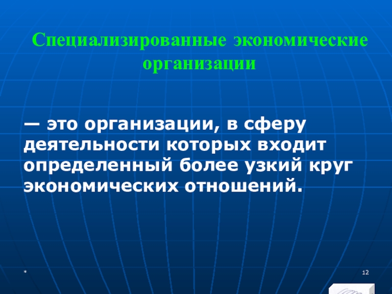 Специализированные экономические  организации— это организации, в сферу деятельности которых входит определенный более узкий круг экономических отношений.