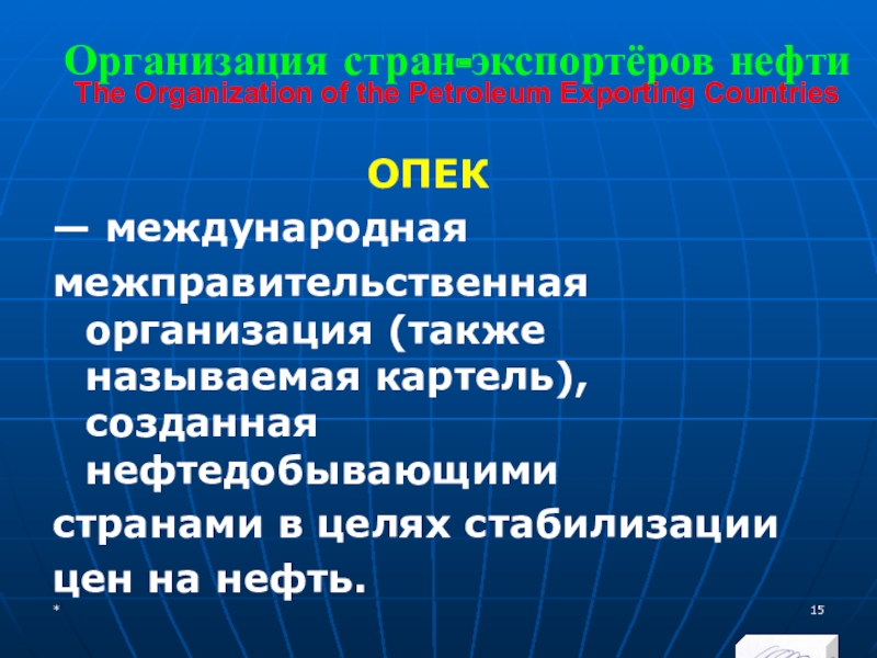 Слайд 15Организация стран-экспортёров нефти The Organization of the Petroleum Exporting Countries