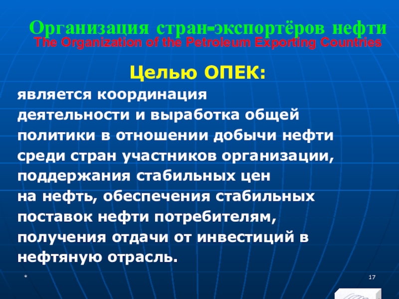 Слайд 17Организация стран-экспортёров нефти The Organization of the Petroleum Exporting Countries