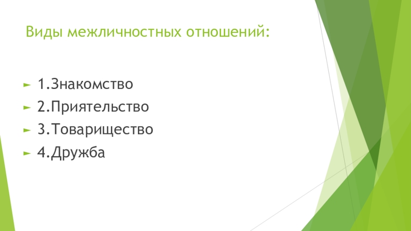 Виды межличностных отношений:1.Знакомство2.Приятельство3.Товарищество4.Дружба
