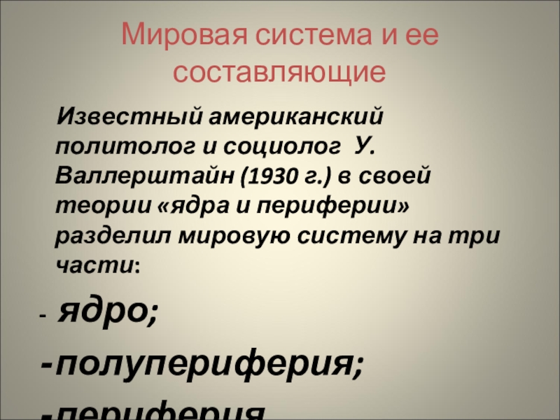 своей теории «ядра и периферии» разделил мировую систему на три части: