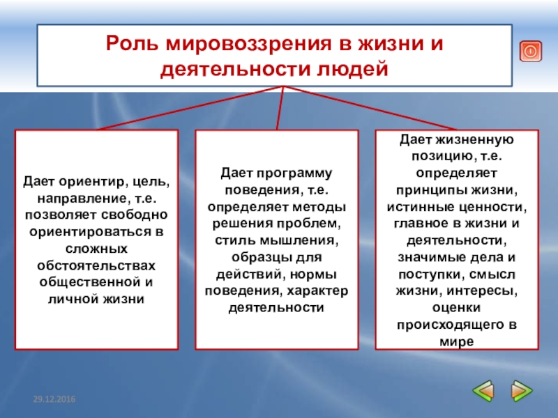 Дает жизненную позицию, т.е. определяет принципы жизни, истинные ценности, главное в жизни и деятельности, значимые дела и поступки, смысл жизни, интересы, оценки происходящего в мире