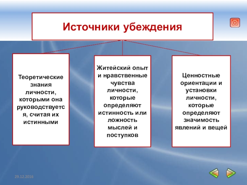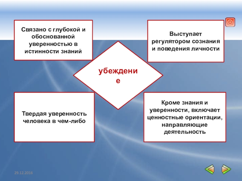 Кроме знания и уверенности, включает ценностные ориентации, направляющие деятельность