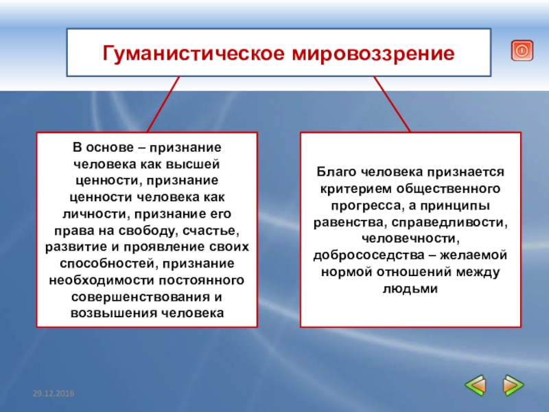 Благо человека признается критерием общественного прогресса, а принципы равенства, справедливости, человечности, добрососедства – желаемой нормой отношений между людьми