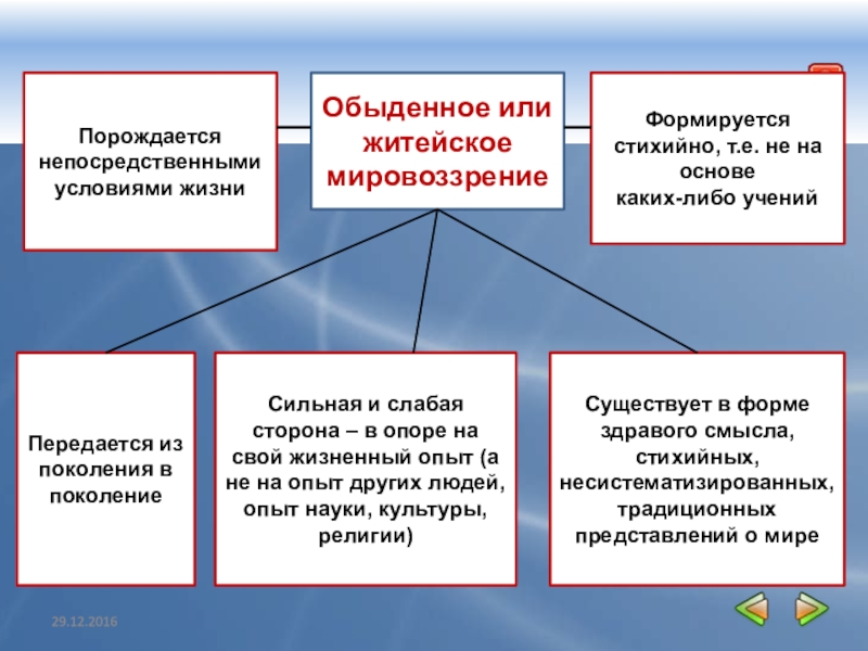 Существует в форме здравого смысла, стихийных, несистематизированных, традиционных представлений о мире