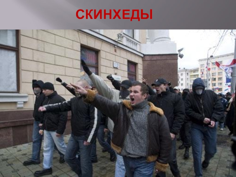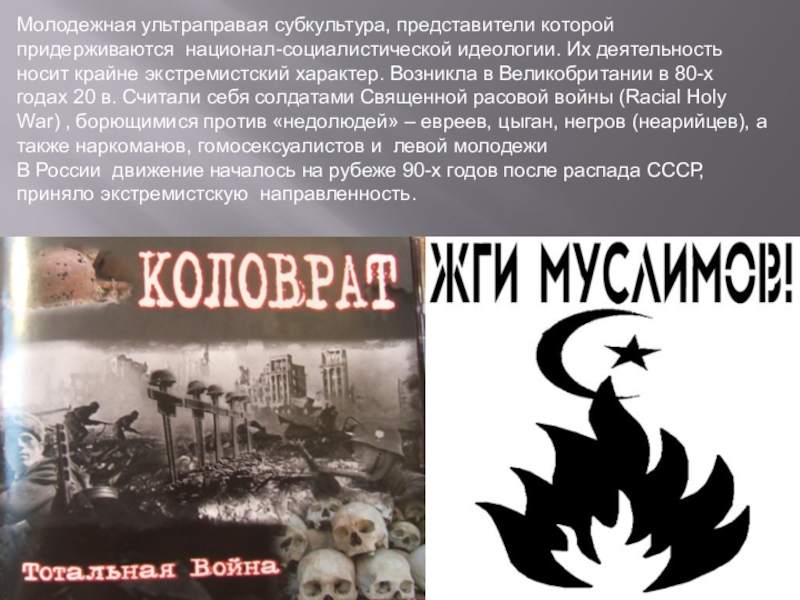Слайд 12Молодежная ультраправая субкультура, представители которой придерживаются национал-социалистической идеологии. Их деятельность носит