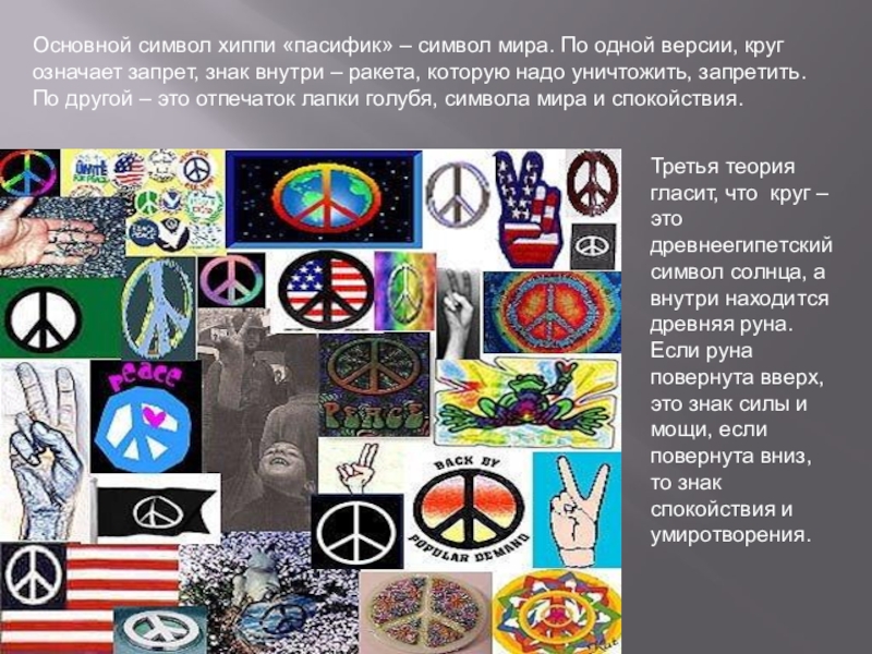 Слайд 9Основной символ хиппи «пасифик» – символ мира. По одной версии, круг