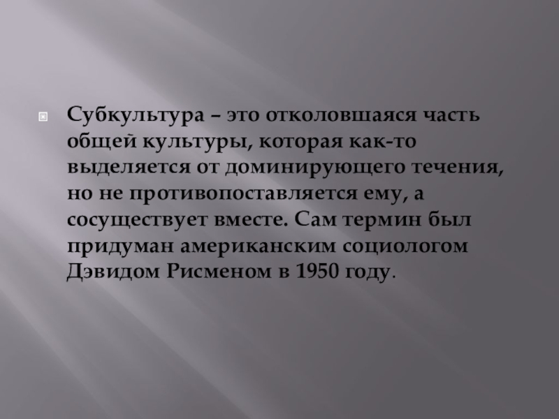 Слайд 3Субкультура – это отколовшаяся часть общей культуры, которая как-то выделяется от
