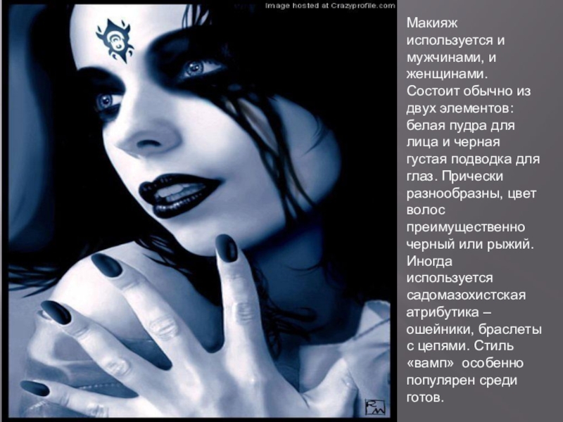 белая пудра для лица и черная густая подводка для глаз. Прически разнообразны, цвет волос преимущественно черный или рыжий. Иногда используется садомазохистская атрибутика – ошейники, браслеты с цепями. Стиль «вамп» особенно популярен среди готов.
