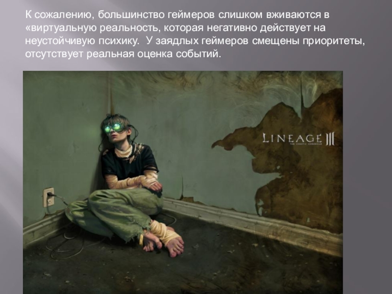 Слайд 36К сожалению, большинство геймеров слишком вживаются в «виртуальную реальность, которая негативно