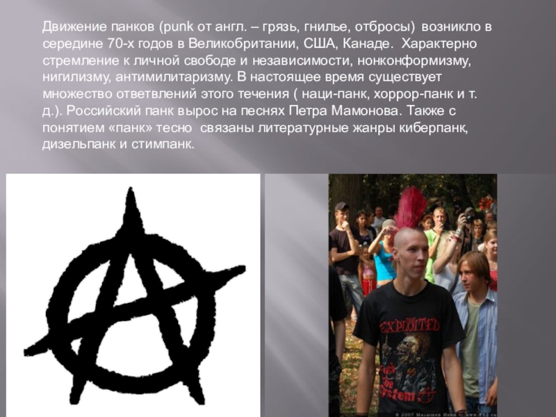 Слайд 16Движение панков (punk от англ. – грязь, гнилье, отбросы) возникло в