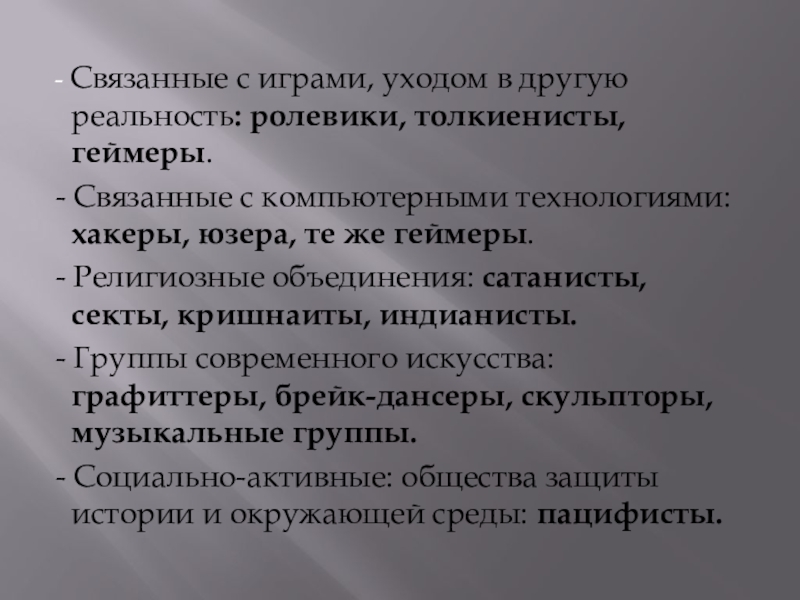- Религиозные объединения: сатанисты, секты, кришнаиты, индианисты.