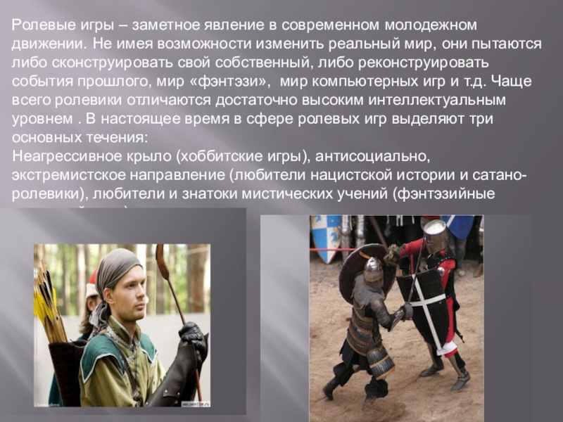 возможности изменить реальный мир, они пытаются либо сконструировать свой собственный, либо реконструировать события прошлого, мир «фэнтэзи», мир компьютерных игр и т.д. Чаще всего ролевики отличаются достаточно высоким интеллектуальным уровнем . В настоящее время в сфере ролевых игр выделяют три основных течения: