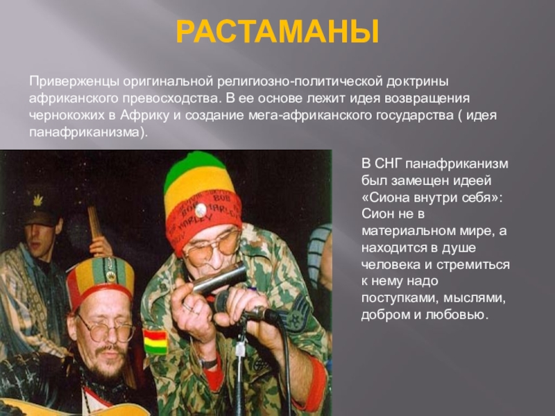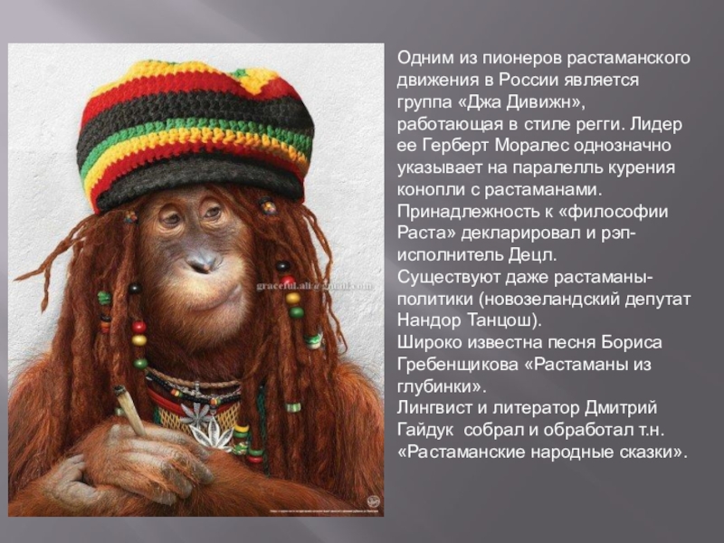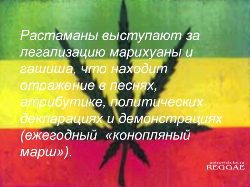 Слайд 31Растаманы выступают за легализацию марихуаны и гашиша, что находит отражение в