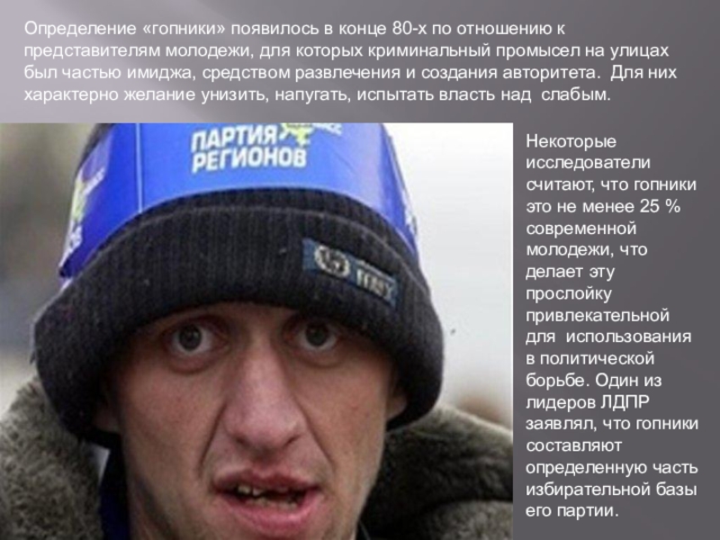 Слайд 38Определение «гопники» появилось в конце 80-х по отношению к представителям молодежи,