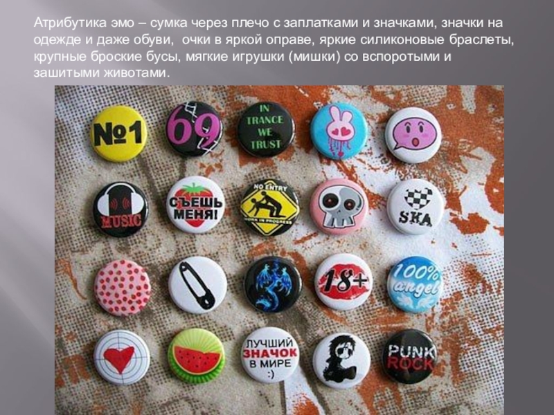 Слайд 25Атрибутика эмо – сумка через плечо с заплатками и значками, значки