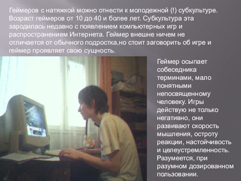 от 10 до 40 и более лет. Субкультура эта зародилась недавно с появлением компьютерных игр и распространением Интернета. Геймер внешне ничем не отличается от обычного подростка,но стоит заговорить об игре и геймер проявляет свою сущность.