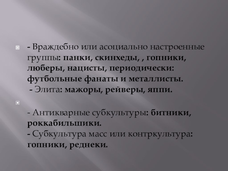 Слайд 6- Враждебно или асоциально настроенные группы: панки, скинхеды, , гопники, люберы,