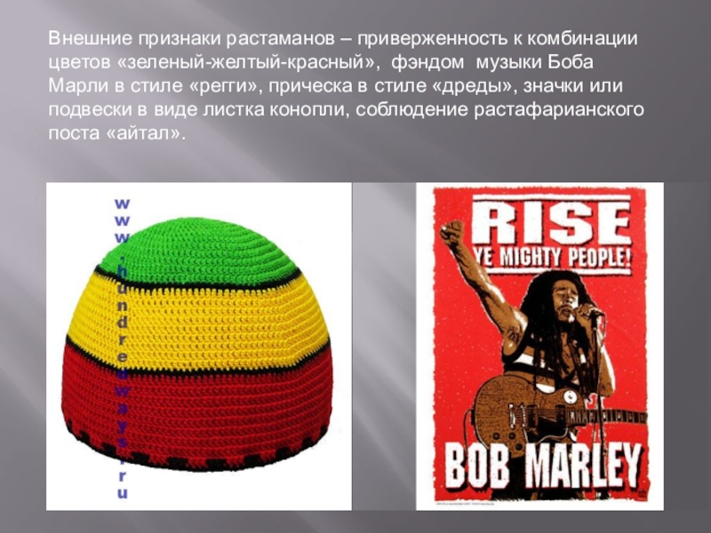 Слайд 30Внешние признаки растаманов – приверженность к комбинации цветов «зеленый-желтый-красный», фэндом музыки