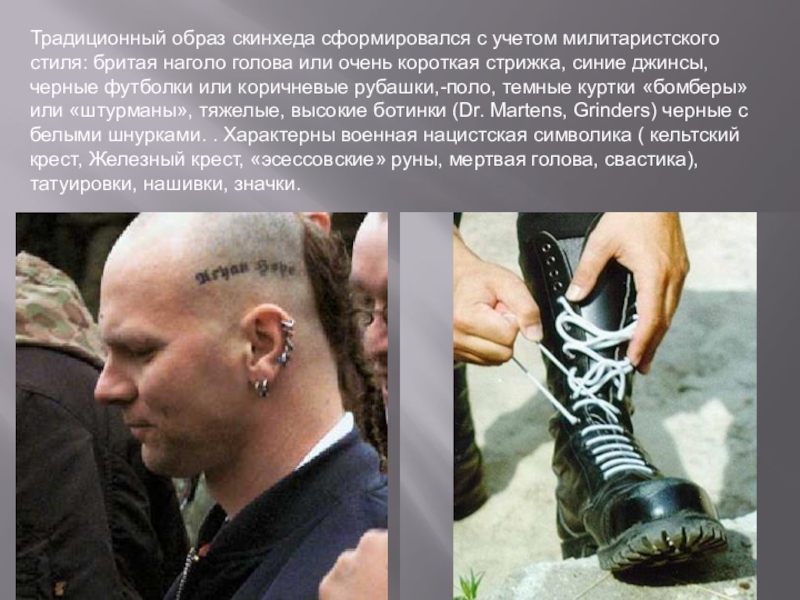 Слайд 14Традиционный образ скинхеда сформировался с учетом милитаристского стиля: бритая наголо голова